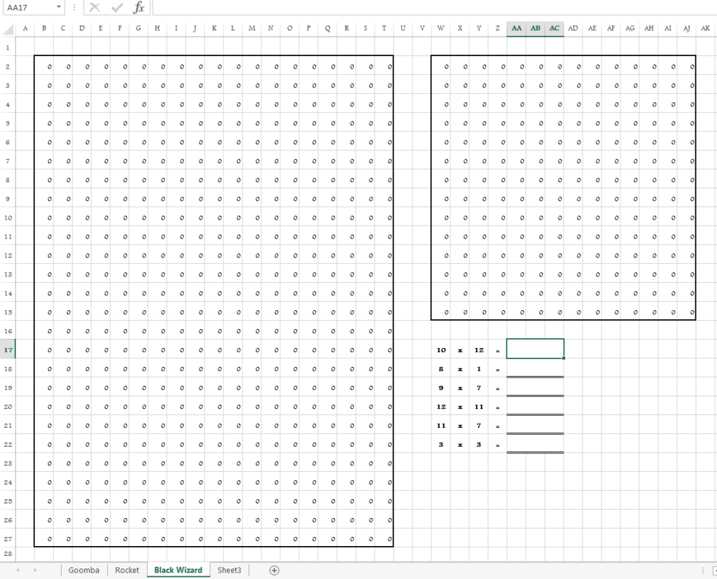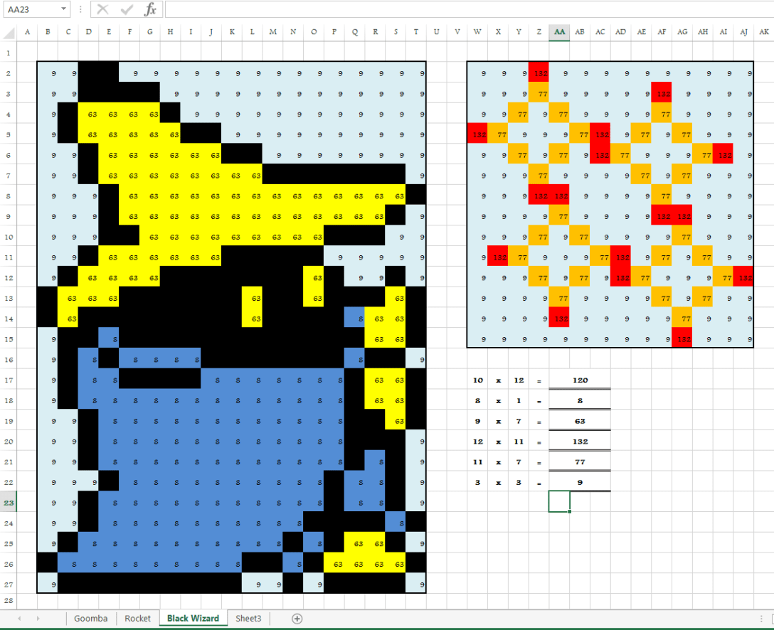 This is the latest in my series of Excel color-by-number worksheets. This one is aimed at introducing students to some of the ‘magical’ properties of multiplication. Multiplication by 1, 10, 11, 9, and squares are all touched on here. For those who aren’t rabid fans of 80’s Nintendo video games, the character is the Black Mage from the game Final Fantasy, unleashing a QUAKE spell.
