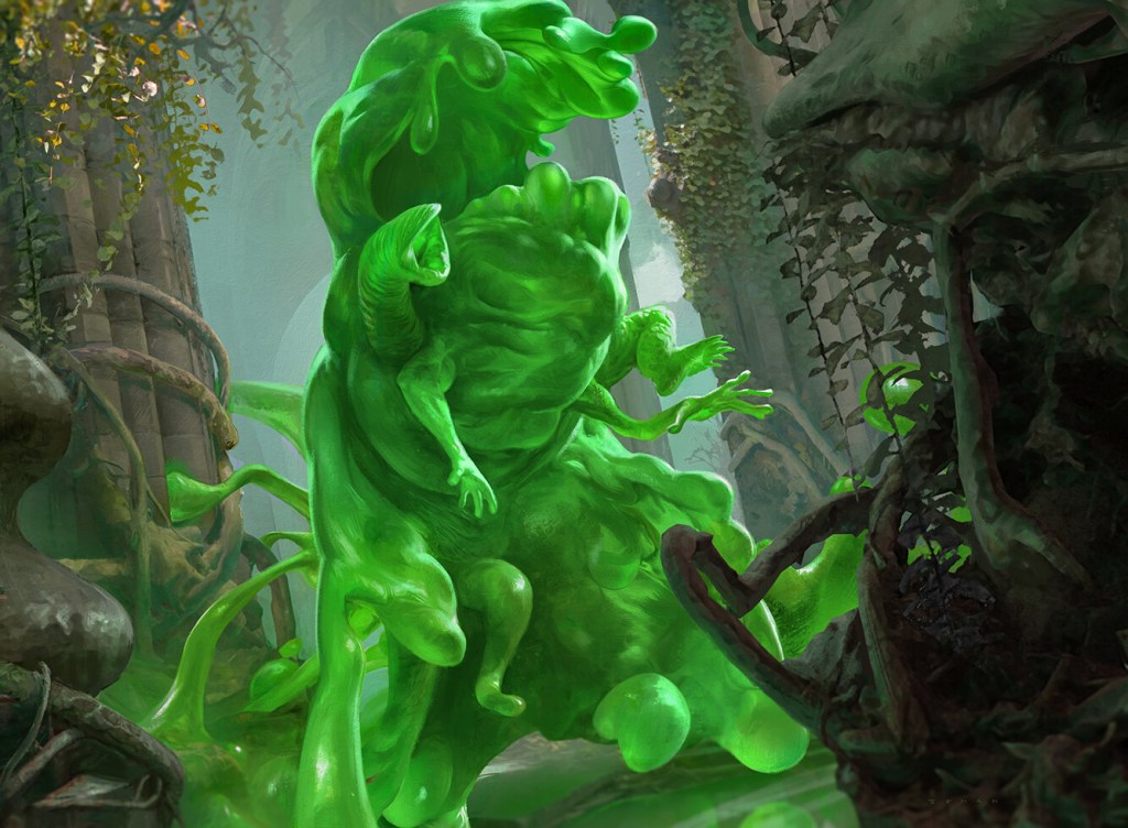 Slurrk and Kraj have been buddies since college and happy with their laid-back bachelor life, but everything has changed now that Vannifar is in their life. Now the race is on to see which oozy dude gets the girl: Slurrk, whose caring and sharing extends to every slime and sludge in his life, or Kraj, who’s so accomplished he can do literally anything anyone else can do. Sit back and watch the sitcom unfold as Slurrk and Kraj try to outdo each other. Who can make the most oozes? Who can make the biggest ooze? Who can dissolve the most of your opponent’s creatures into puddles of stinking acidic slime? You’ll laugh so hard, your belly will shake like a bowl full of jelly! It’s slime time in the old town tonight!
